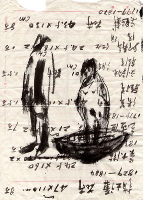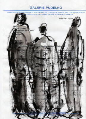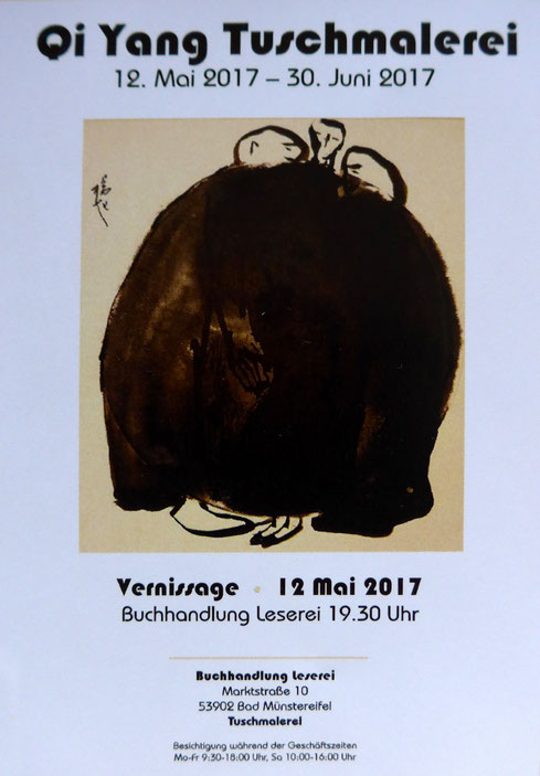 Heute stellen wir die Werke von Qi Yang aus, die schon in Shanghai zu sehen waren. Es ist Tuschmalerei montiert auf Seidenpapier, welches vier Meter lang ist. Die Pinselführungen sind frei und leicht. Er kann feine Liebesbande zwischen Männern und Frauen sowie ihre Alltäglichkeiten, usw. nur mit ein paar Strichen höchst anschaulich darstellen.